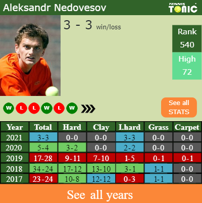 Nedovesov has a winning record in the last 10 years having won 56% of his matches (277-218). 3-3 on indoor hard courts in 2021. Regarding his performance on the same surface of this competition, Nedovesov has a compiled 60-44 win-loss record in the last years on indoor hard courts.