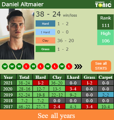 Altmaier has an overall 38-24 win-loss record in 2021, 1-2 on hard (See FULL STATS).