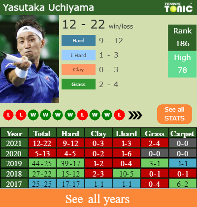 In terms of his career, Yasutaka has an overall 368-287 record. He has a positive 262-183 record on hard.