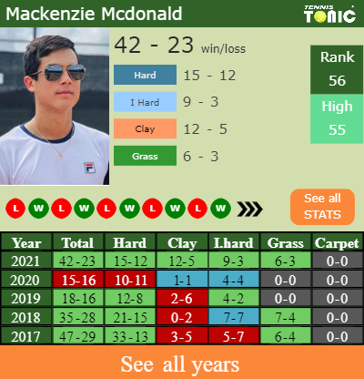 Mcdonald has an aggregate 42-23 win-loss record in 2021, 9-3 on indoor hard courts (See FULL STATS).