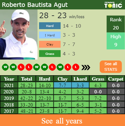 The Spaniard has a composed 28-23 win-loss record in 2021, 3-3 on indoor hard courts (See FULL STATS).