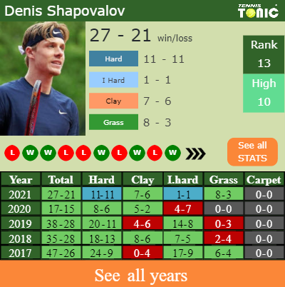 Denis has an overall 27-21 win-loss record in 2021, 1-1 on indoor hard courts (See FULL STATS).