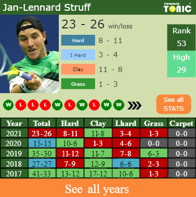 The German has an overall 23-26 win-loss record in 2021, 3-4 on indoor hard courts (See FULL STATS).