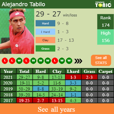 Tabilo has an overall 29-27 win-loss record in 2021, 17-13 on clay (See FULL STATS).