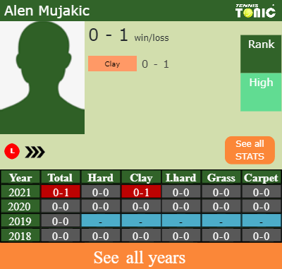Mujakic has an overall 0-1 win-loss record in 2021, 0-0 on carpet (See FULL STATS).