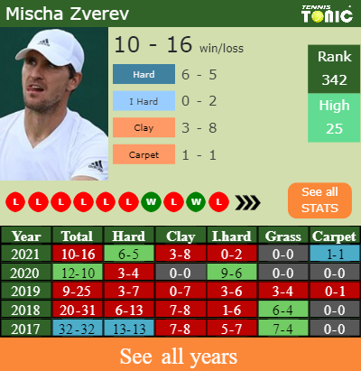 Zverev has an overall 10-16 win-loss record in 2021, 1-1 on carpet (See FULL STATS).