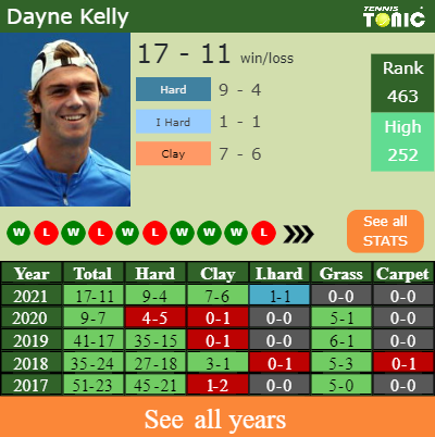 Kelly has an aggregate 17-11 win-loss record in 2021, 1-1 on indoor hard courts (See FULL STATS).