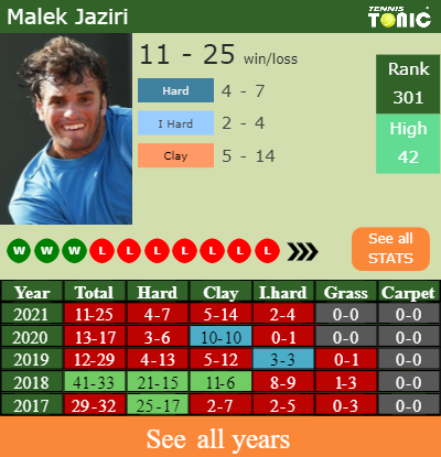 The Tunisian has a composed 11-25 win-loss record in 2021, 2-4 on indoor hard courts (See FULL STATS).