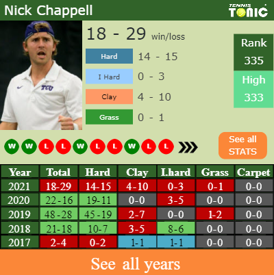 Chappell has a compiled 18-29 win-loss record in 2021, 0-3 on indoor hard courts (See FULL STATS).