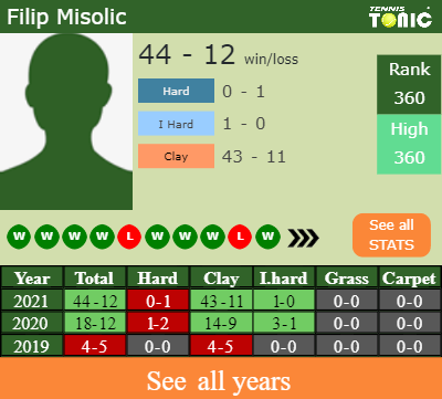 Misolic has a solid win-loss record in the last 3 years having won 69% of his matches (66-29). 1-0 on indoor hard courts in 2021. Talking about his performance on the same surface of this event, Misolic has an overall4-1 win-loss record in the last 3 years on indoor hard courts.