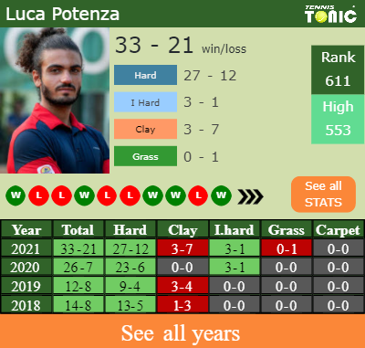 Potenza has an overall 33-21 win-loss record in 2021, 3-1 on indoor hard courts (See FULL STATS).