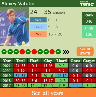 Vatutin has an aggregate 24-35 win-loss record in 2021, 9-8 on indoor hard courts (See FULL STATS).