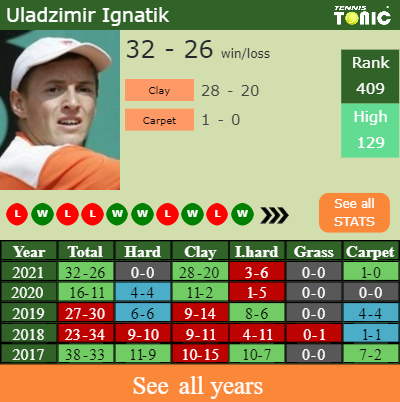 Ignatik has an aggregate 32-26 win-loss record in 2021, 1-0 on carpet (See FULL STATS).