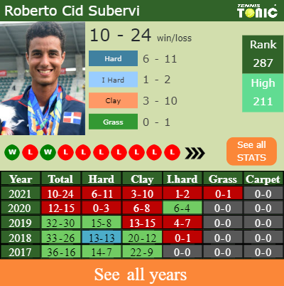 Roberto has a composed 10-24 win-loss record in 2021, 3-10 on clay (See FULL STATS).