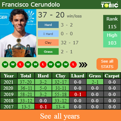 Francisco has an overall 37-20 win-loss record in 2021, 32-17 on clay (See FULL STATS).