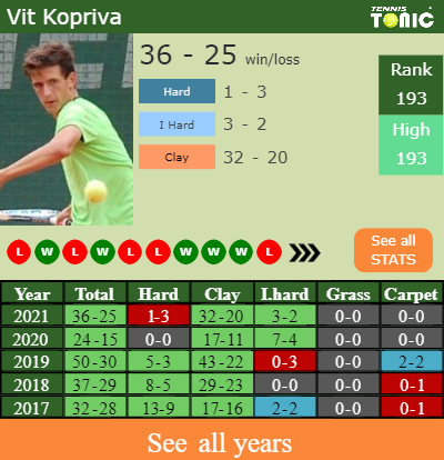 In terms of his career, Kopriva has an overall 233-157 record. He has a positive 171-110 record on clay.