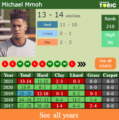 Michael has an overall 13-14 win-loss record in 2021, 0-1 on indoor hard courts (See FULL STATS).