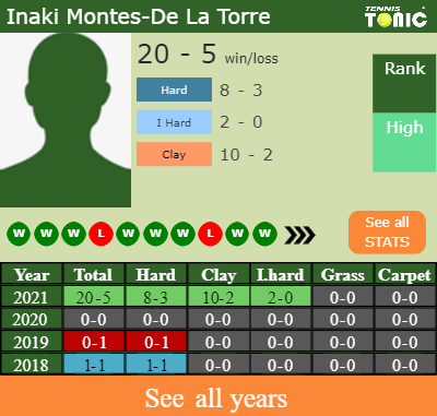 Montes-De La Torre has a fantastic match record in the last 2 years having won 75% of his matches (21-7). 2-0 on indoor hard courts in 2021. Talking about his performance on the same surface of this competition, Montes-De La Torre has a compiled2-0 record in the last 2 years on indoor hard courts.