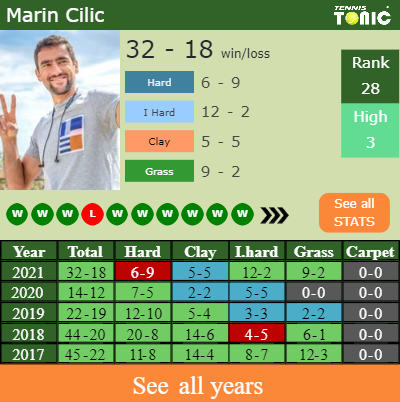 Cilic has a solid record in the last 10 years having won 66% of his matches (362-187). 12-2 on indoor hard courts in 2021. Regarding his performance on the same surface of this event, Cilic has an overall 79-39 record in the last years on indoor hard courts.