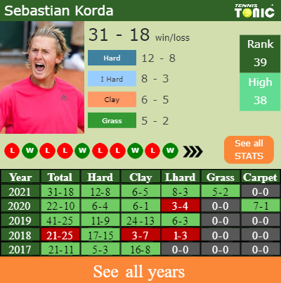 Sebastian has an overall 31-18 win-loss record in 2021, 8-3 on indoor hard courts (See FULL STATS).