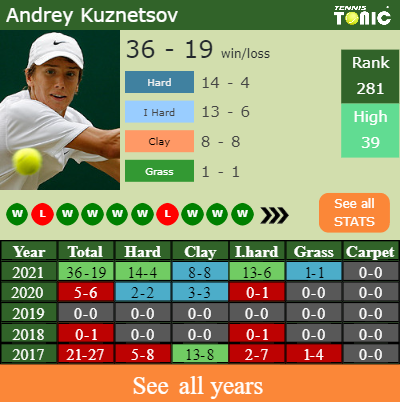 Kuznetsov has a compiled 36-19 win-loss record in 2021, 14-4 on hard (See FULL STATS).