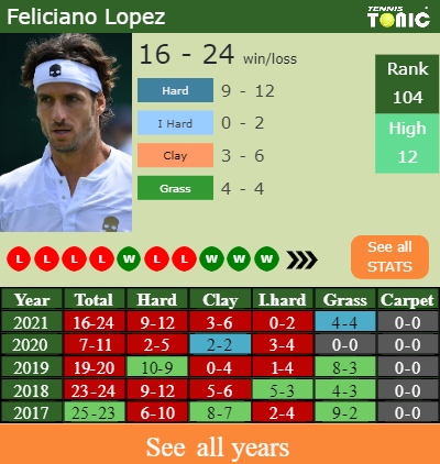 Lopez has a good win-loss record in the last 10 years having won 52% of his matches (249-226). 9-12 on hard in 2021. Talking about his performance on the same surface of this competition, Lopez has a compiled 108-101 match record in the last years on hard.