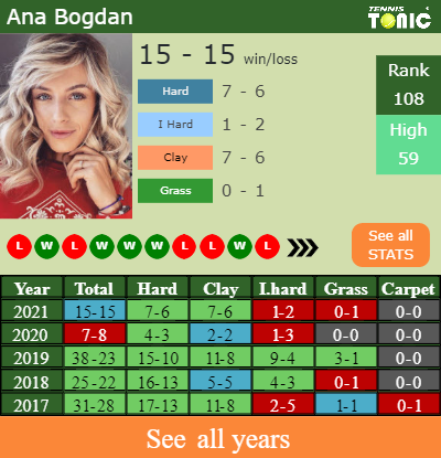 Ana has a compiled 15-15 win-loss record in 2021, 1-2 on indoor hard courts (See FULL STATS).