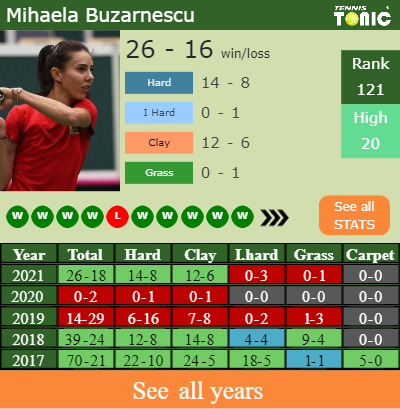 Mihaela has an overall 26-18 win-loss record in 2021, 0-3 on indoor hard courts (See FULL STATS).