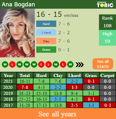 Bogdan has a solid win-loss record in the last 10 years having won 63% of her matches (296-175). 2-2 on indoor hard courts in 2021. In connection with her performance on the same surface of this competition, Bogdan has an aggregate 37-28 win-loss record in the last years on indoor hard courts.