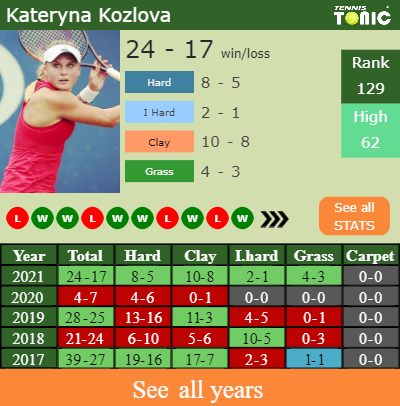 Kateryna has an aggregate 24-17 win-loss record in 2021, 2-1 on indoor hard courts (See FULL STATS).