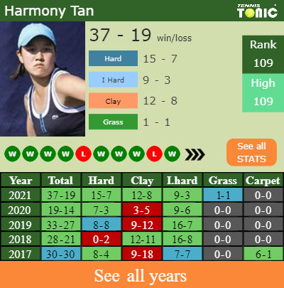 Tan has a winning record in the last 6 years having won 58% of her matches (194-138). 9-3 on indoor hard courts in 2021. Regarding her performance on the same surface of this event, Tan has a composed62-35 match record in the last 6 years on indoor hard courts.