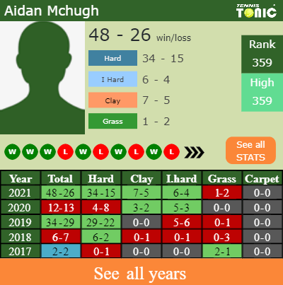 Aidan has an overall 48-26 win-loss record in 2021, 6-4 on indoor hard courts (See FULL STATS).