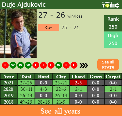 The Croatian has an aggregate 27-26 win-loss record in 2021, 2-5 on indoor hard courts (See FULL STATS).