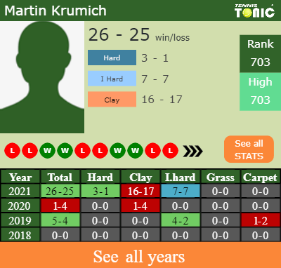 Krumich has a composed 26-25 win-loss record in 2021, 7-7 on indoor hard courts (See FULL STATS).