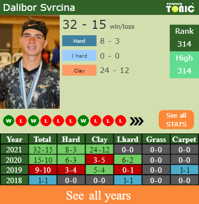 In terms of his career, Svrcina has an overall 57-36 record. He has a positive 7-4 record on indoor hard courts.