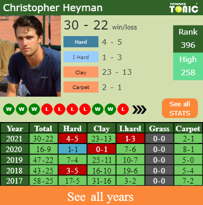 Christopher has an overall 30-22 win-loss record in 2021, 1-3 on indoor hard courts (See FULL STATS).