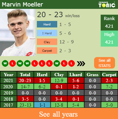This will be the 2nd time that Christopher Heyman and Marvin Moeller fight against each other. The head to head is 1-0 for Moeller (see full H2H stats), 1-0 on indoor hard courts.