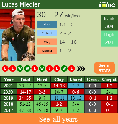 Miedler has an aggregate 30-27 win-loss record in 2021, 2-2 on indoor hard courts (See FULL STATS).