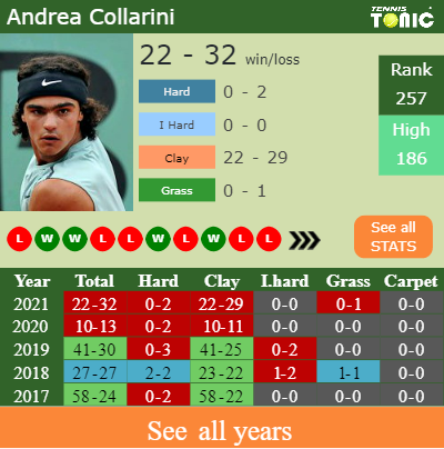 In terms of his career, Collarini has an overall 452-309 record. He has a positive 431-269 record on clay.