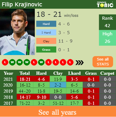 Filip has an aggregate 18-21 win-loss record in 2021, 3-5 on indoor hard courts (See FULL STATS).