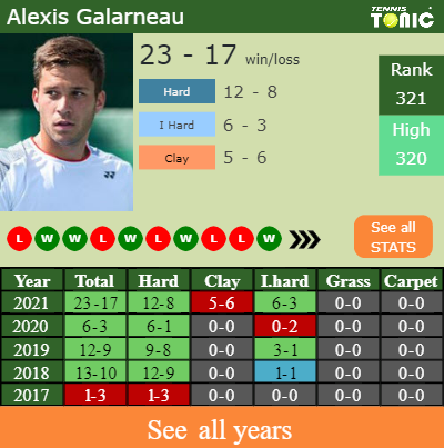 Galarneau has a winning record in the last 7 years having won 54% of his matches (61-51). 6-3 on indoor hard courts in 2021. Talking about his performance on the same surface of this tournament, Galarneau has a composed10-9 record in the last 7 years on indoor hard courts.