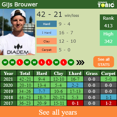 Gijs has a compiled 42-21 win-loss record in 2021, 16-7 on indoor hard courts (See FULL STATS).