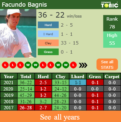 The Argentine has a composed 36-22 win-loss record in 2021, 33-15 on clay (See FULL STATS).