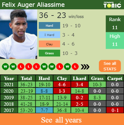 Auger-Aliassime has an overall 36-23 win-loss record in 2021, 3-4 on indoor hard courts (See FULL STATS).
