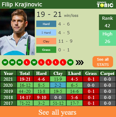 Krajinovic has an aggregate 19-21 win-loss record in 2021, 4-5 on indoor hard courts (See FULL STATS).