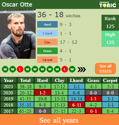 Otte has a solid match record in the last 8 years having won 64% of his matches (328-187). 1-1 on indoor hard courts in 2021. In connection with his performance on the same surface of this competition, Otte has an aggregate54-41 match record in the last 8 years on indoor hard courts.