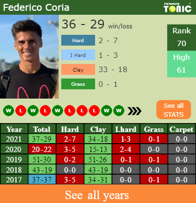 Coria has a solid win-loss record in the last 10 years having won 63% of his matches (457-271). 34-18 on clay in 2021. In connection with his performance on the same surface of this competition, Coria has an overall 446-241 match record in the last years on clay.