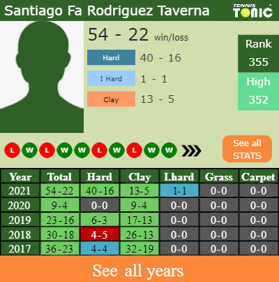 Fa Rodriguez Taverna started his run at this tournament from the qualifications. In the main draw, he has conceded 2 set in the tournament to win 51% of the points he played.