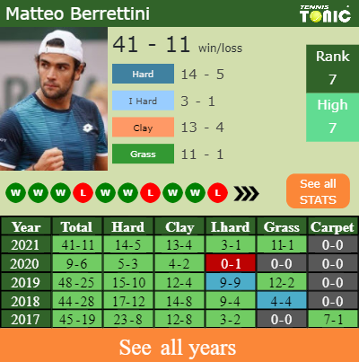 Berrettini has an aggregate 41-11 win-loss record in 2021, 3-1 on indoor hard courts (See FULL STATS).