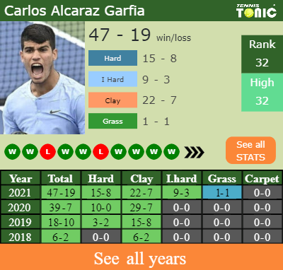 Alcaraz Garfia has an aggregate 47-19 win-loss record in 2021, 9-3 on indoor hard courts (See FULL STATS).